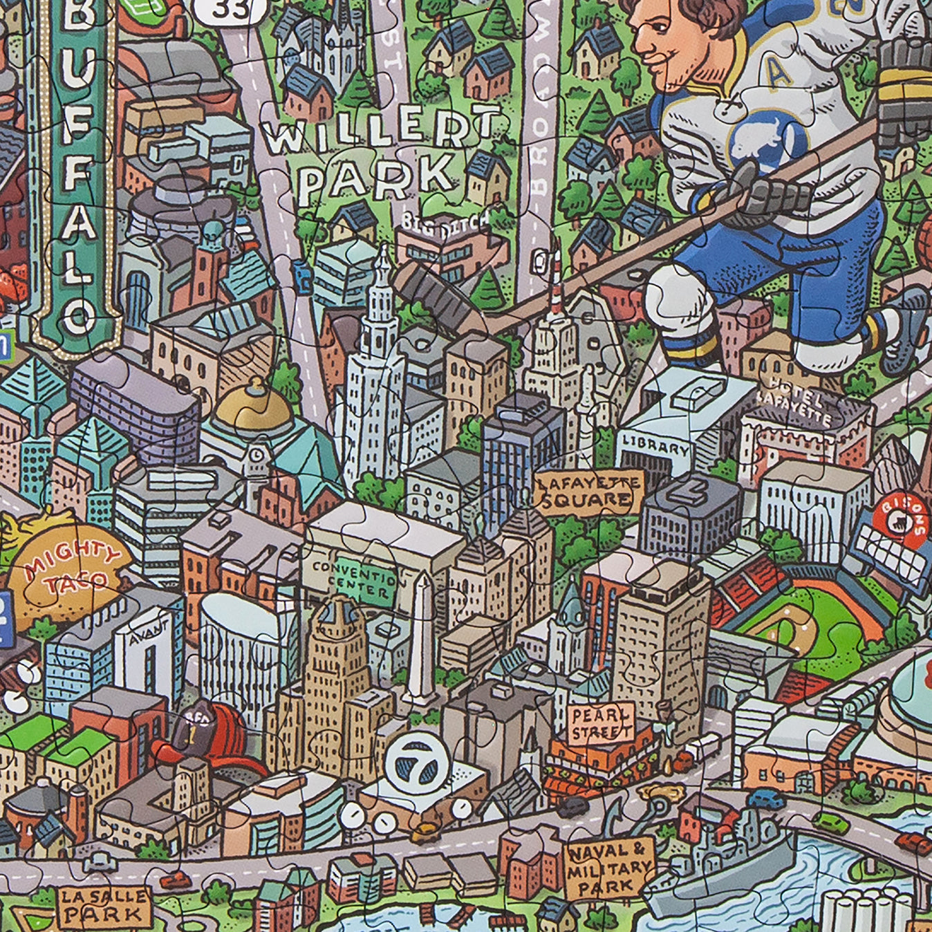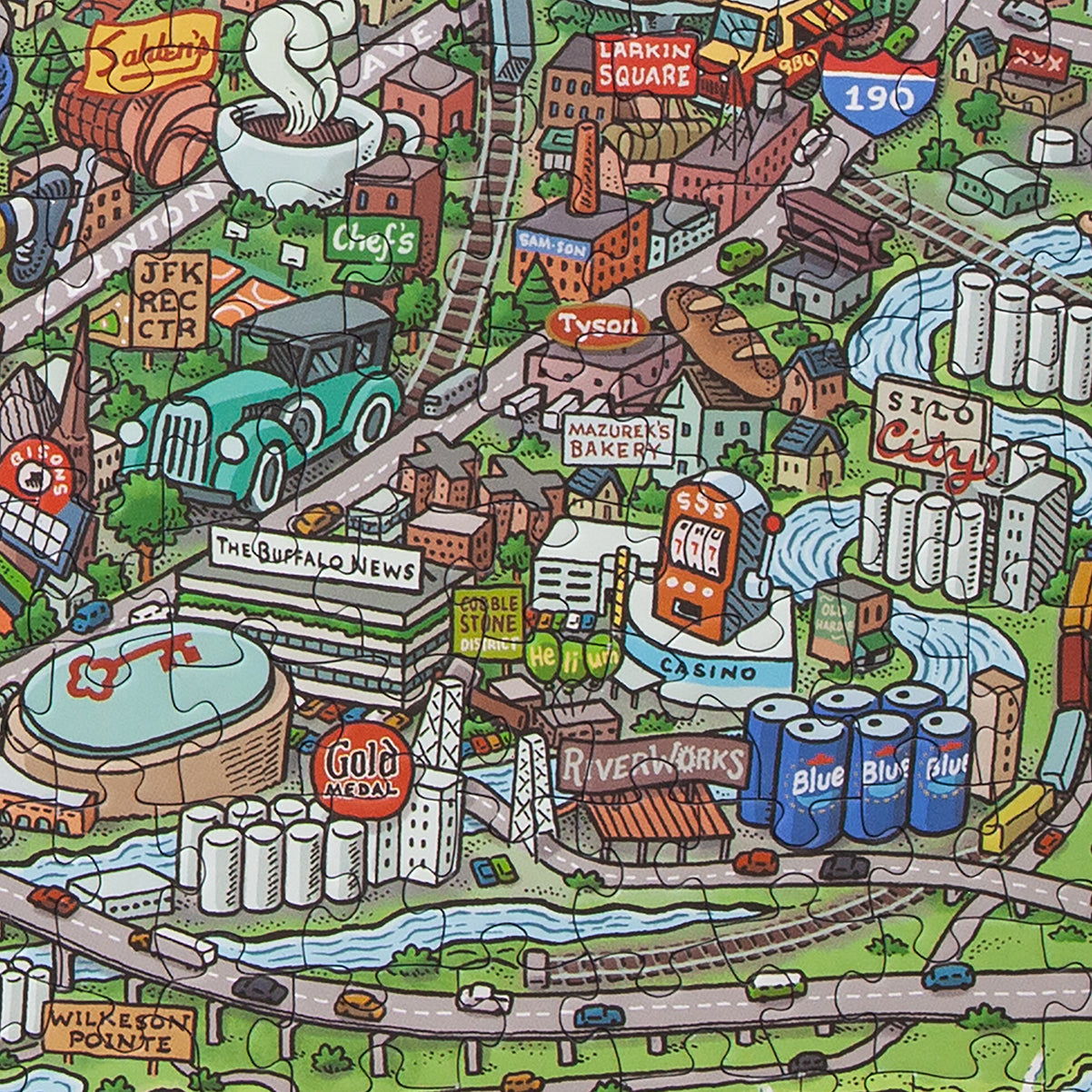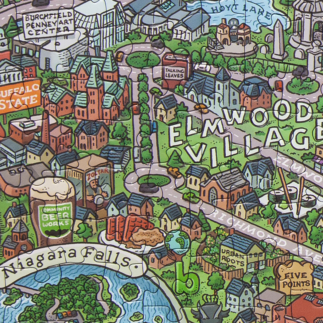 Discover all the cool quirks and unique oddities that makes Buffalo so great with this super fun and incredibly detailed 1,000 piece map puzzle. Featuring restaurants, shops, and icons that locals know and love; you'll have a blast exploring your favorites and discovering something new. Artist Mario Zucca's vibrant and crisp illustrations makes this puzzle a work of art and highly frame worthy. It's the perfect gift for every fan of Buffalo, NY.