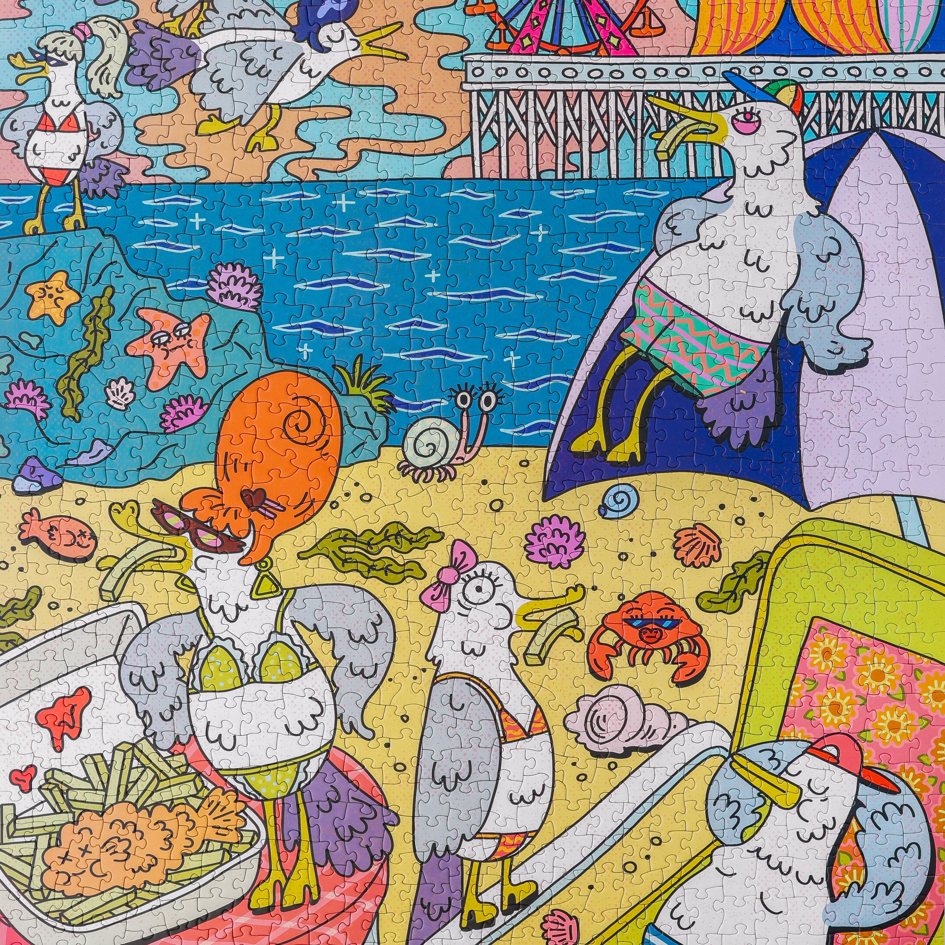 Tiny bird bikinis!? Say more, please.... Artist Emily Reay makes the annoying beach birds look like the raddest party, even if they are stealing your fries. Bright, colorful and quirky, this is THE puzzle for your summer vacay or winter blues get-a-way.