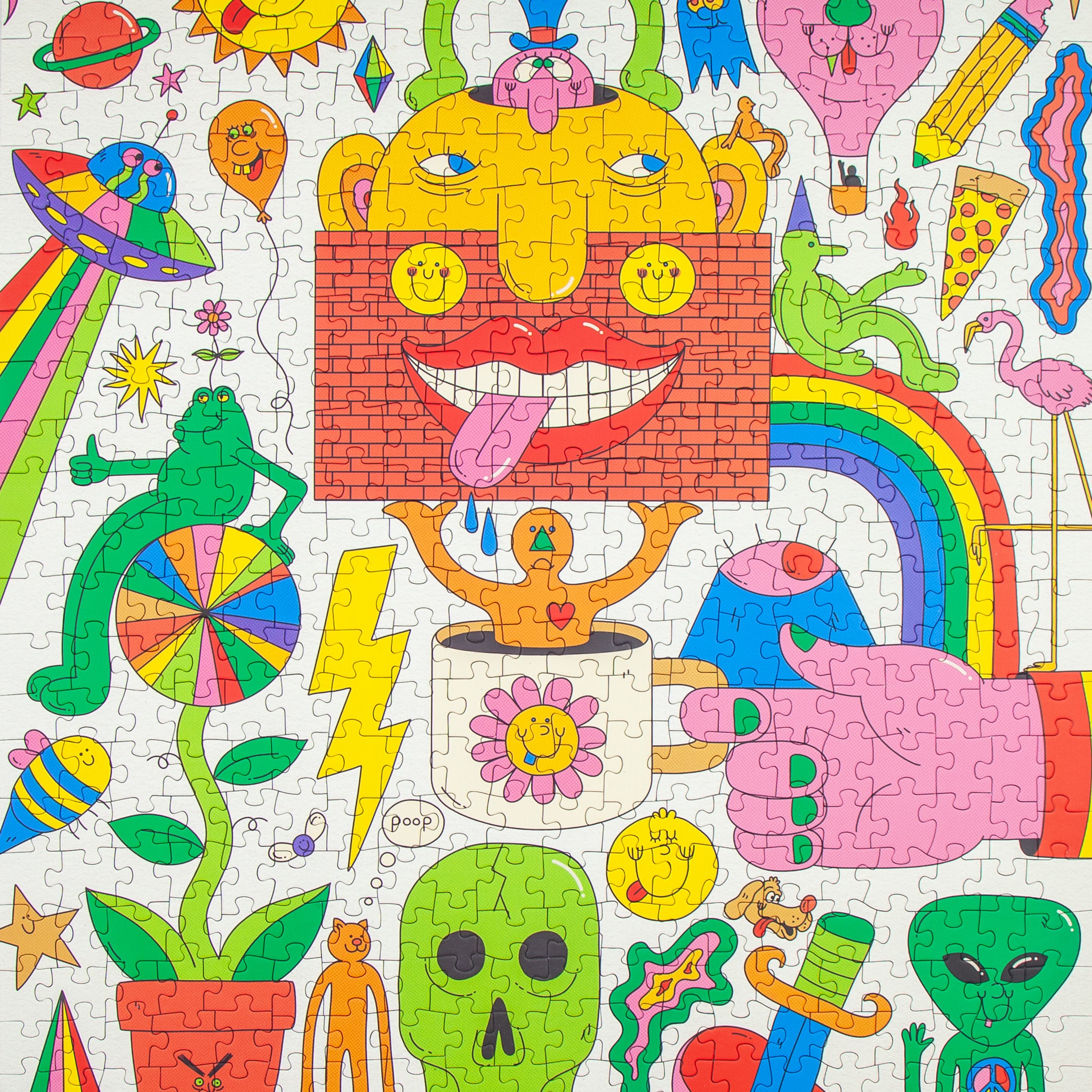 This puzzle is rad. Filled with quirky characters, it reminds us of flash tattoo sheets you might find at your wildest tattoo shop. We're down! California artist James Carey has an amazingly fun style, first class use of color, and deep imagination. This puzzle is a blast!